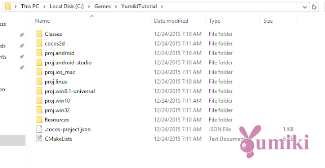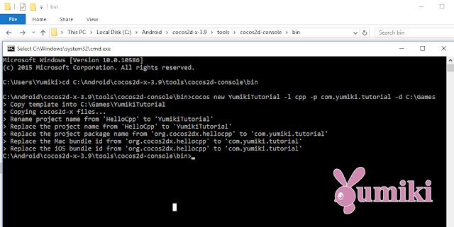 command: cocos new YumikiTutorial -l cpp -p com.yumiki.tutorial -d C:\Games